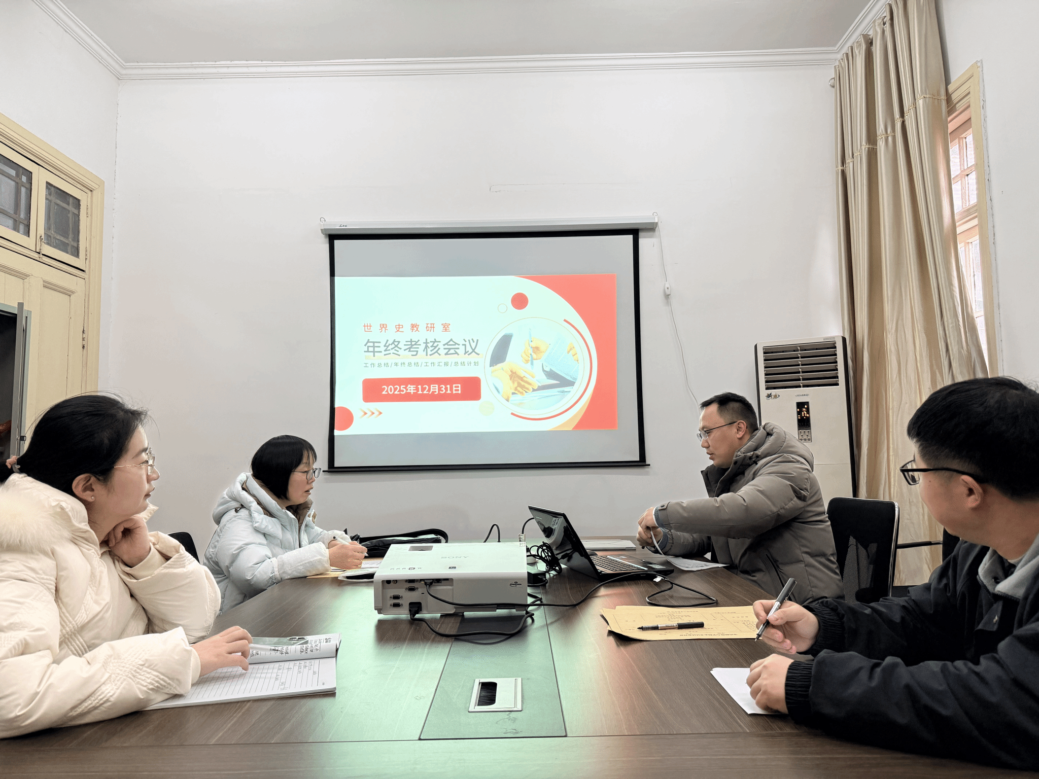 在随后举行的专题学习与教研室年终考核会议上,支部集中学习了习近平总书记重要讲话精神,围绕“以高质量党建引领团队建设”“以世界历史视野服务中国式现代化阐释”等主题开展交流研讨。与会教师结合自身研究方向,探讨了如何在世界史教学、AI智慧课程建设、区域国别研究等方面贯彻落实习近平总书记重要讲话精神。同时,会议对教研室本学期教学、科研与管理工作进行了年终总结和评优活动,系统梳理了课程建设、项目申报、员工培养等方面的成效与不足,明确了下一阶段的改进方向和重点任务。