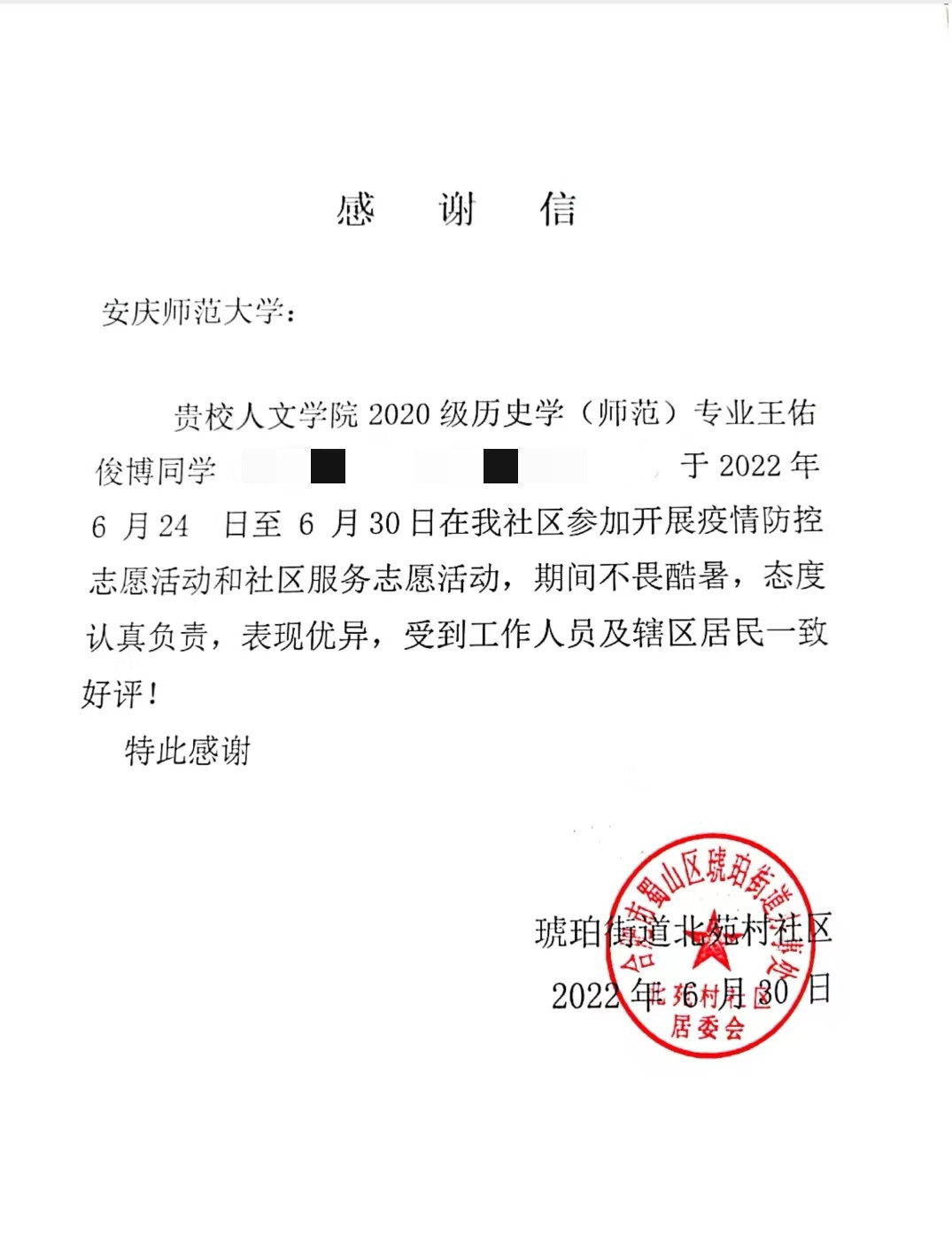 近日,suncitygroup太阳成集团收到合肥市蜀山区琥珀街道北苑村社区的感谢信。信中对suncitygroup太阳成集团2020级历史学专业王佑俊博同学暑期疫情防控志愿服务活动予以高度评价。