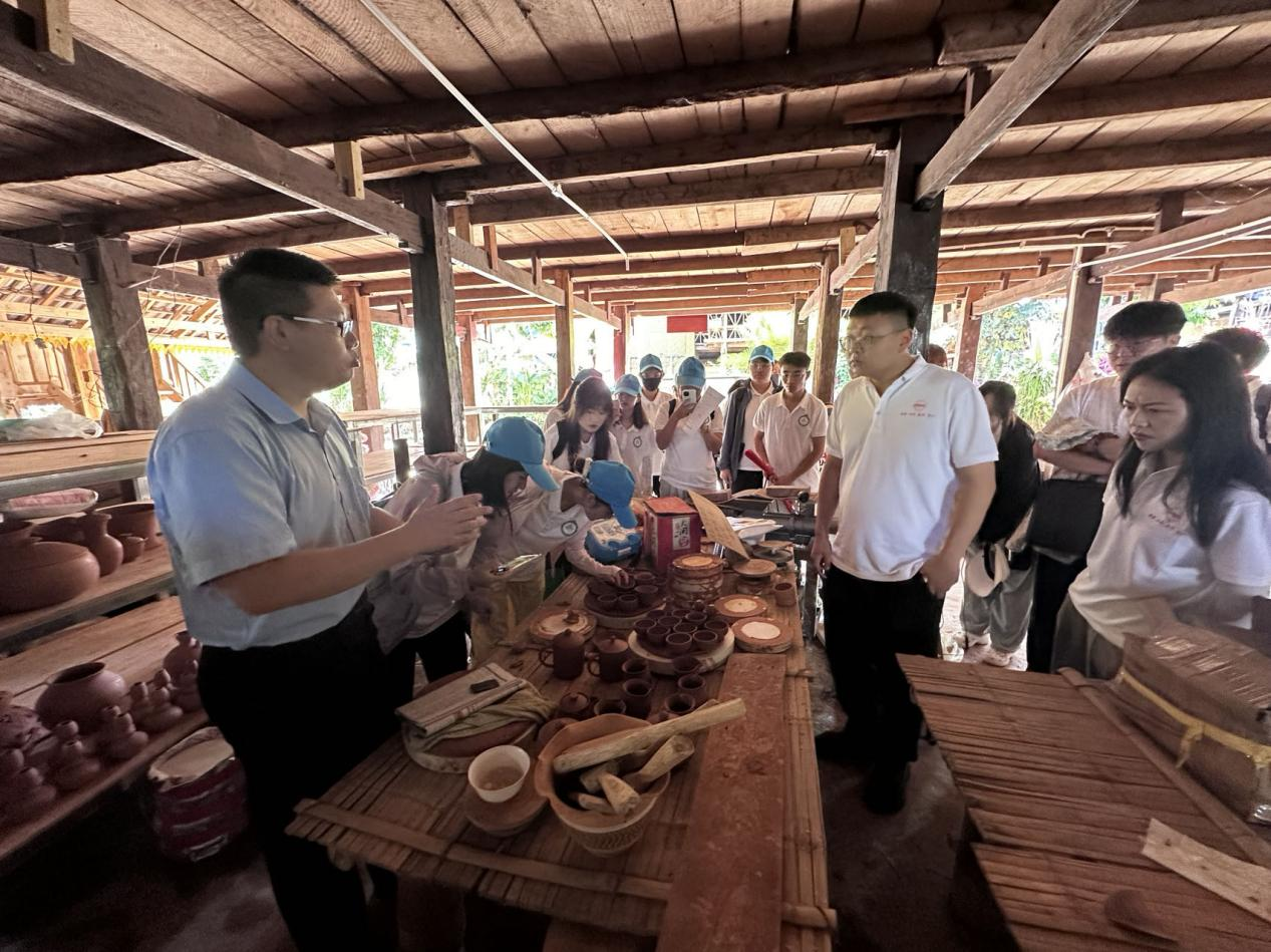 在磨憨村委会磨整村民小组,驻村工作同志向实践团队介绍了安宁市帮扶以来的成果。安宁市以“小切口大变化”真真切切地改善生活条件,带领少数民族同胞们解决了用水问题、道路硬化、照明亮化、环境美化等急难愁盼问题,实现“居卧榻可饮山泉”,不断提高各族群众获得感、幸福感、安全感。此外,磨整村依托傣族手工艺慢轮制陶技艺——国家级首批非物质文化遗产,建立非遗技艺教培基地,游客可以参观并个性化定制自己的陶器,体验傣陶的制作过程,既能提升收入,又能发扬傣族传统文化。