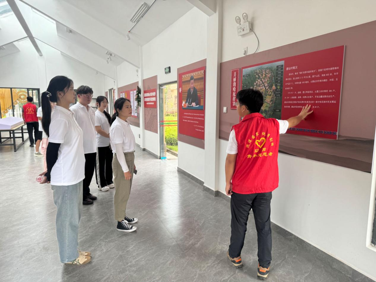 “在大家眼前的四幅图分别是忠爱桥、南坡让地、哈尼丰收节、哈尼长街宴。这都是我们哈尼族同胞与傣族同胞的特色文化故事……”实践团成员来到尚勇村委会磨站村民小组,随着村委会志愿者的讲解前往磨站村村史馆。馆内依次陈列着村寨简介、民族文化、乡村振兴、帮带共建纪实、村寨旧貌新颜等展板,将村寨基本情况与发展变化呈现至实践团成员眼前。
