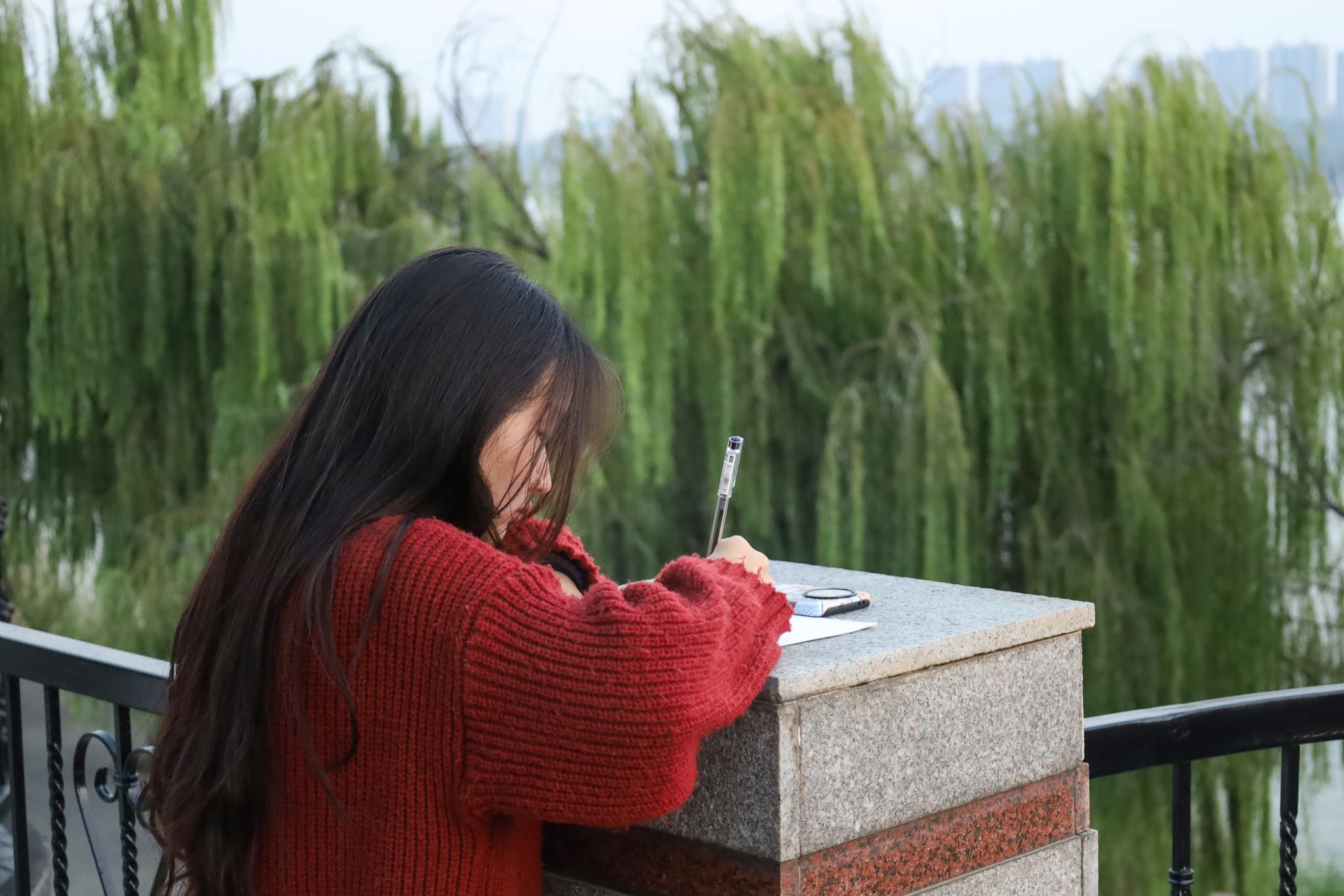 “夕阳磕破天空的墙壁,波涛随着风响起呼唤。”“岩石与钢铁铸成的轮渡,也在柳条掀起的长浪里颠簸。”……活动伊始,员工们三两结伴,行走在江边,围绕着落日、江水、柳树、轮渡等景象,寻找诗歌的灵感来源。“当我被江边落日的余晖笼罩全身时,灵感不禁浮现。” 中国语言文学类专业2023(8)班的解雨桐说。她坦言,她不是第一次进行诗歌创作,所以有一点的写作经验想要更好地进行创作,就需要一双善于发现美、感受美、欣赏美的眼睛,以及一颗能被平凡事物触动的心灵。