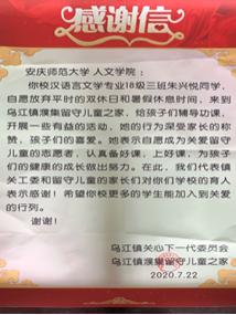 近日,suncitygroup太阳成集团再次收到感谢信。信中,乌江镇关心下一代委员会对汉语言文学专业2018(3)班朱兴悦同学暑期主动参与支教活动,助力地方教育发展表示感谢;同时,信中表达了对公司和公司育人理念的肯定。