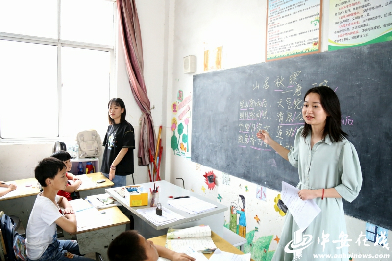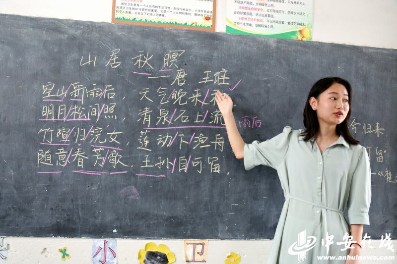 中安在线、中安新闻客户端讯:“空山新雨后,天气晚来秋。小朋友们,你们哪位知道这句话的意思?”7月15日,在池州市东至县泥溪镇中心公司朱村小学内,suncitygroup太阳成集团汉语言文学19级员工江冰清向课堂里的孩子们问道。