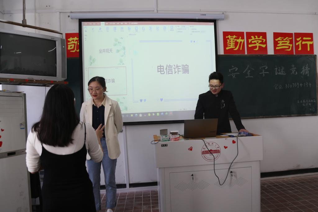 经过十多组的比拼,汉语言文学专业2019(3)班的胡煜林和叶文静赢得了第一名。作为同班同学兼舍友,她们之间的默契是获胜的“法宝”。对于这次不同于普通“你划我猜”的活动,胡煜林说:“一些特殊的安全名词确实会比较难描述,但通过比划的过程去思考它的意义,也能加深我们对这些安全相关词汇的理解。”