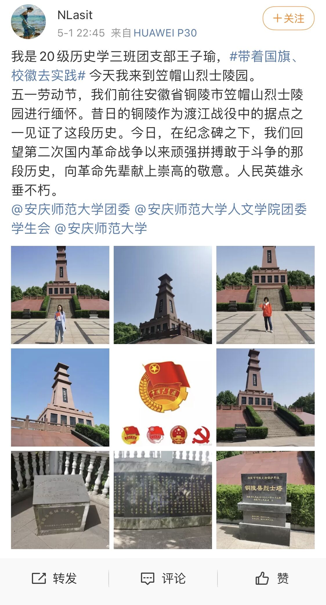 为深入开展党史学习教育,帮助青年员工增强爱党敬党意识,提升政治素养、网络素养,传播网络正能量,5月1日至5日,公司结合校团委精神的要求,开展“带着国旗、校徽去实践”图文征集活动。公司员工积极报名,踊跃参与。2019、2020级邱美玲、蔡洁、李士龙等同学自行选择黄镇生平事迹陈列馆、合肥渡江战役纪念馆等红色教育基地,佩戴校徽、团徽、员工证与国旗、团旗进行合影并写下文字感言,进行图文编辑后在新浪微博发表。