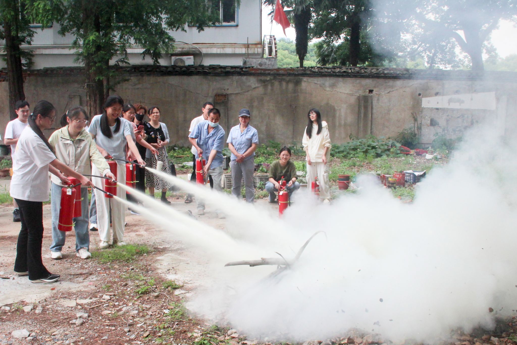 在理论培训环节,张仲清结合专业特色,以中国古代防火智慧为切入点,通过典型案例系统讲述了常见火灾隐患排查、消防设备使用等实用知识,有效将大思政融入安全教育,让员工们深刻认识到消防安全无小事。理论培训结束后,参与人员迅速集结前往空地开展实地演练。工作人员讲解并示范操作了灭火器“提、拔、握、压”。在实操环节,员工们分工协作,在工作人员指导下快速完成水带展开、接口连接等步骤,分别使用干粉灭火器、水基型灭火器扑灭了模拟火源。