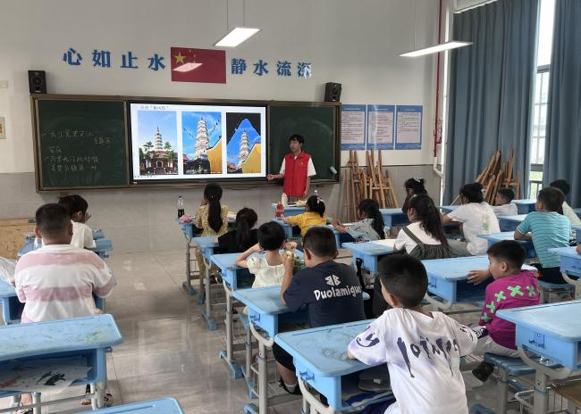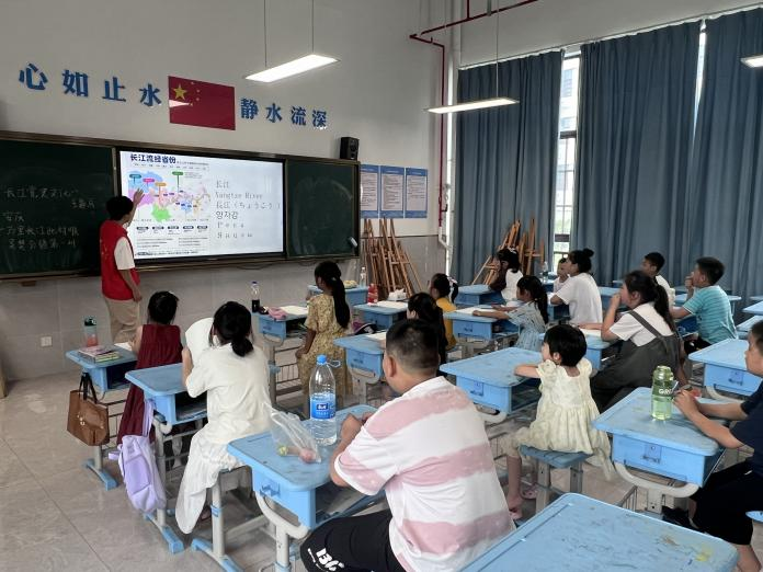 志愿者向孩子们介绍“长江第一塔”
