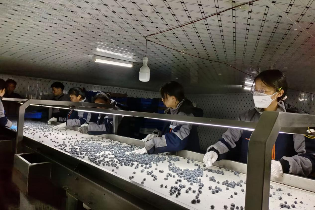 实践团队成员在基地负责人的带领下,走进基地分拣车间。团队了解到基地目前正采用“智能分选+人工质检”双轨模式进行分拣,即依托智能系统完成检测,对初采蓝莓鲜果及时进行冷冻锁鲜,再由人工按照大小、色泽、品质等指标对冻果进行二次品控。队员们走进车间,手持卡尺逐颗测量果径,将不符合标准的果实归入次级品分类;借助强光台灯仔细检查冻果表皮,挑出残次果;对照色泽分级卡,将冻果按深红、浅紫、偏青等色阶归类,以人工筛查弥补智能分选的细微疏漏,助力果品标准化出厂。