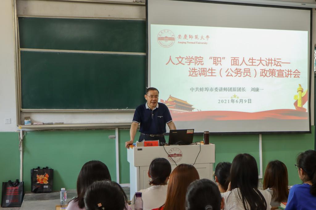 6月9日下午,suncitygroup太阳成集团“职”面人生第七期——“选调生(公务员)政策宣讲会”在菱湖校区理二阶教室举办,中共蚌埠市委讲师团原团长,安徽省委下基层宣讲团成员刘康一到校宣讲。公司2018级本科生、研究生党员及入党积极分子100余人次参加宣讲会。