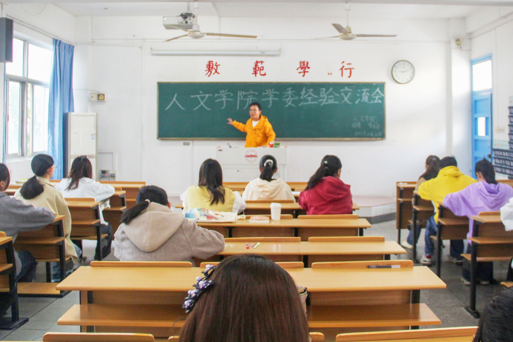 2024级汉语言文学专业文典班张羽佳结合工作实际,讲述了如何高效有序做好相关工作,搭建师生有效沟通的桥梁,并针对如何平衡学习与工作、如何科学做好时间分配分享了经验。2025级中国语言文学类(4)班郑国泰听完经验分享后,表达了今后将通过“四看”工作法,即向上对接老师、向下关注同学需求、向前严格落实考勤,向后常态化复盘反省问题来进一步夯实学风。