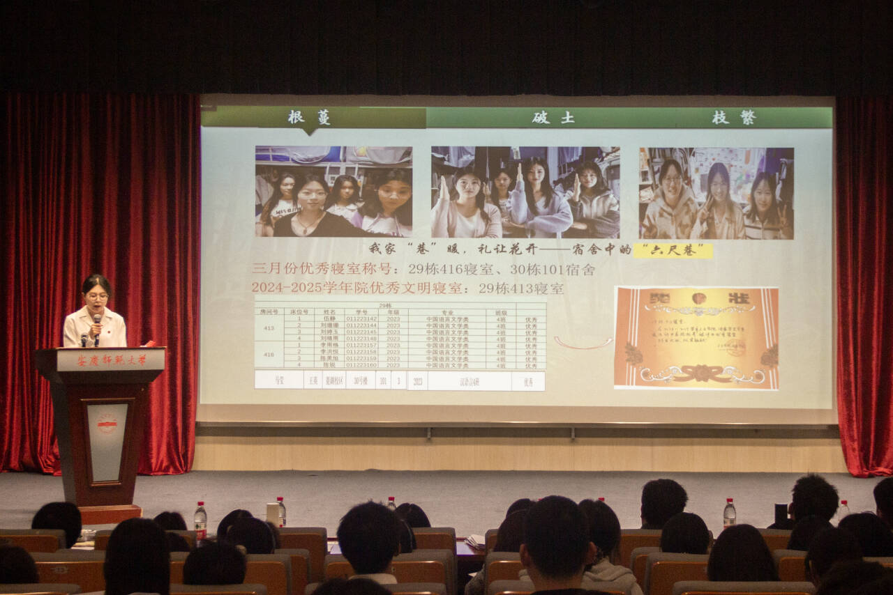 各班围绕班级管理、学风建设、文化营造、志愿服务等方面,结合专业特色,全面呈现班级建设成果。汇报现场亮点纷呈,特色鲜明。2023级汉语言文学专业(7)班以“思想引领+集体聚力”为主线,通过党团建设、主题班会带动班级同学学科与文体竞赛参与率实现100%;2023级历史学专业(2)班发起“校史讲述人”系列活动,实现专业学习与服务实践深度融合;2024级汉语言文学专业(2)班实施“班委轮讲制”,定期总结班务、共商发展计划,推动集体议事成为凝聚共识的重要机制;2024级汉语言文学文典班以员工学术能力锻炼为例,彰显了班级学风建设实效。