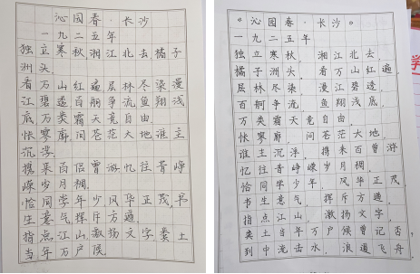 书法比赛以经典古诗词为内容,采用硬笔、软笔的书写形式。比赛过程中,参赛者们个个专心致志、一丝不苟,一笔一划仔细斟酌,一撇一捺彰显风采,用心书写每一个汉字。同学们握笔正确,坐姿端正,表现出良好的书写习惯,所写作品笔画流畅,横平竖直,结构均匀,美观大气。