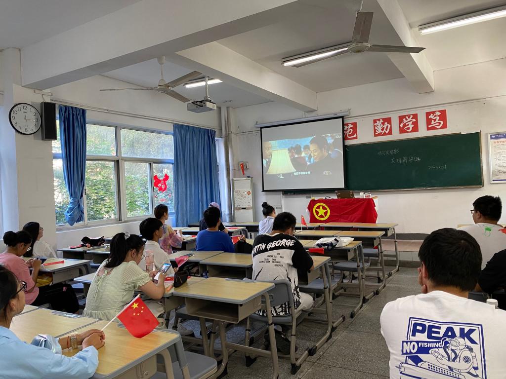 观影过程中,同学们全神贯注,不时被共产党人在困难中彰显的初心和使命所感动。当镜头转换到解放上海时,解放军战士即便是因为连夜作战精疲力尽,却未占用民宅,而是集体整齐地睡在了马路上,在场观影的同学无一不流下了感动的泪。而这也让人们看到了中国共产党为什么会取得胜利,看到了中国的未来。当毛主席站上天安门城楼进行庄严宣告时,全体同学肃然起立,为“中国人民从此站起来了,中华人民共和国中央人民政府今天成立了”热烈鼓掌。