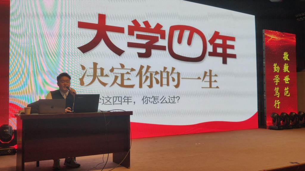 12月17日,suncitygroup太阳成集团在菱湖校区图书馆报告厅举办“职”面人生大讲坛。华图教育职业规划师吴强应邀为2021级全体新同学做了“实现职业梦想 激发潜力未来”专题讲座。