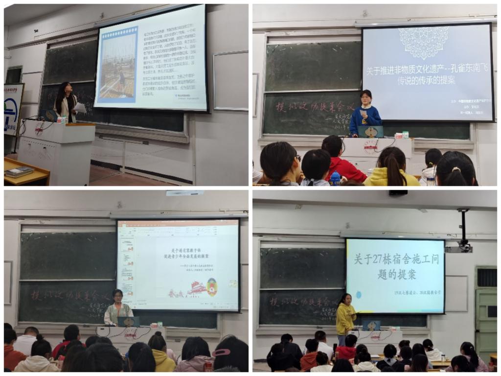 4月3日为模拟政协提案会议阶段,经过征集,共有校园建设组、教育建设组、民生建设组、文化建设组合计18个提案。会上,参赛选手通过提案展示、提案陈述、提案讨论的方式进行汇报,并由现场观众进行投票。