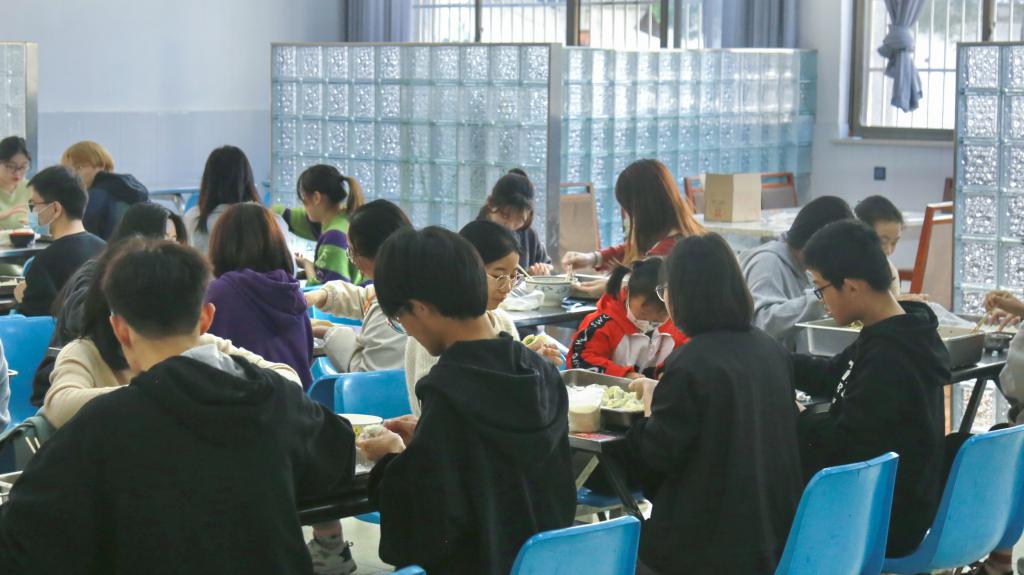 分发馅料、饺子皮、托盘,进行四人一桌的简单分组后,40余名员工们很快就投入了各自的工作。除了普通的饺子形状,汉语言文学专业2020(2)班的崔佳慧还对饺子的形状做了一些创新:“月牙形”“大肚形”“元宝形”,一些其他小组的成员们也被吸引了前来观摩。