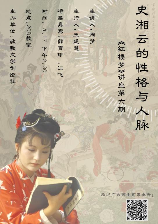 “我今天来呢,是把电视上的史湘云送过来给你们看看”。4月17日下午,1987版《红楼梦》中史湘云一角的饰演者郭霄珍老师来到了讲座现场。原来,这是suncitygroup太阳成集团敬敷文学创造社举办的《红楼梦》讲座第六期—史湘云的性格与人脉。