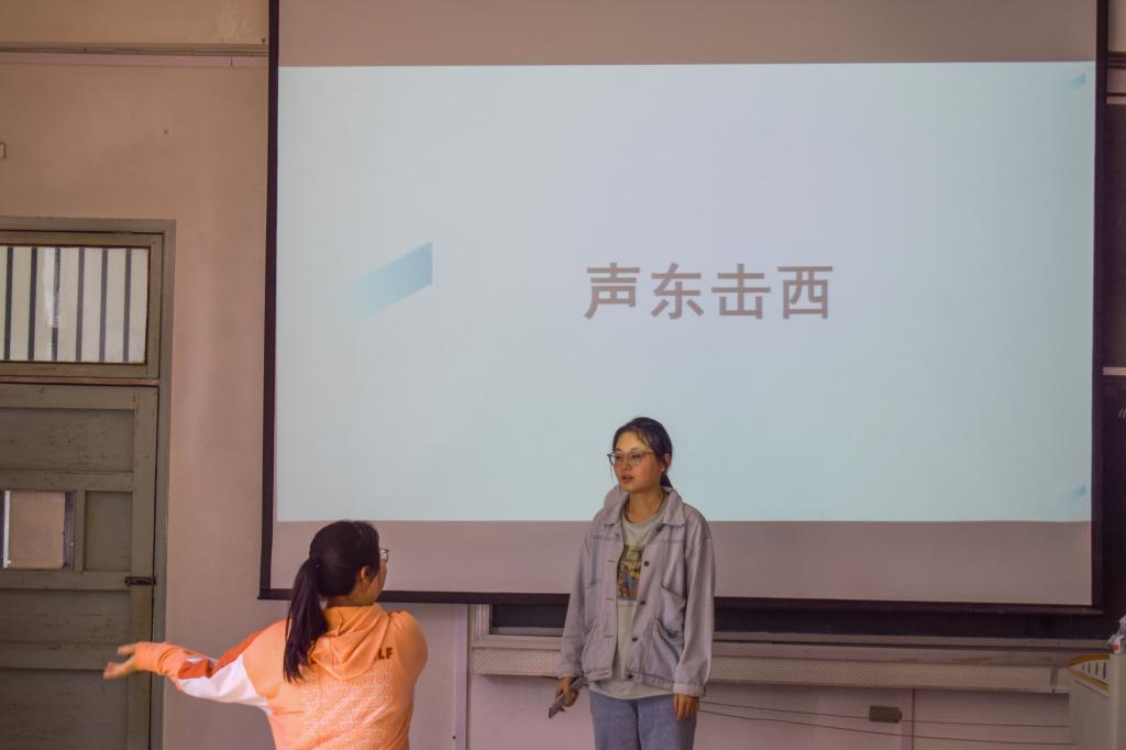 中国语言文学类专业2021(2)班的曹颖和蒋静雯作为第一组上场,只见她们一个努力用肢体语言比划着,并辅以少数言语,有时还因过度紧张而激动得语无伦次,另一人在对面猜测。台下的观众们也是热情高涨,一起互相讨论、嬉笑,气氛很是热闹。