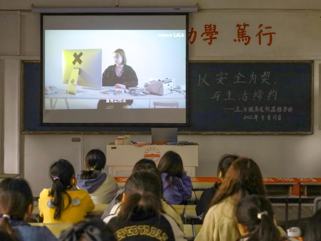 横幅签名、知识宣讲、观看影片。4月17日下午,活动在教学楼303教室展开。本次影片从“电信诈骗”切入,介绍了网络上多种常见的“套路”。来自历史学专业2020(3)班的王榆晴观看影片后,对此颇有感悟,她坦言:“其实多数老员工因为缺乏社会经验和辨别能力,很容易让陌生人有可乘之机。所以我们平时更需要多关注社会诈骗案件,提高安全防范意识,学会自我保护。”