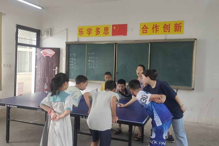 为了培养竞争意识,锻炼体魄,实践团的成员为孩子们设置了趣味投篮比赛、三人篮球赛、乒乓球联赛等丰富的体育课程。孩子们和团队成员频繁互动,相互鼓励,在比赛中增进了友谊,在输赢中收获了成长。炎热的天气阻止不了孩子们的奔跑,运动让孩子们更具活力,强身健体的观念扎根孩子们的心中。
