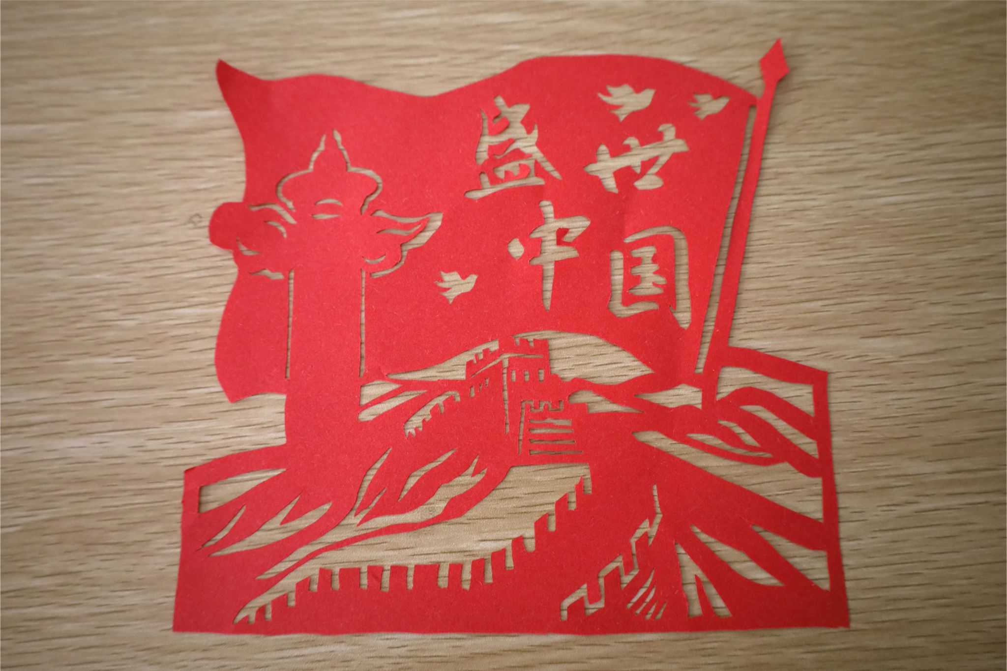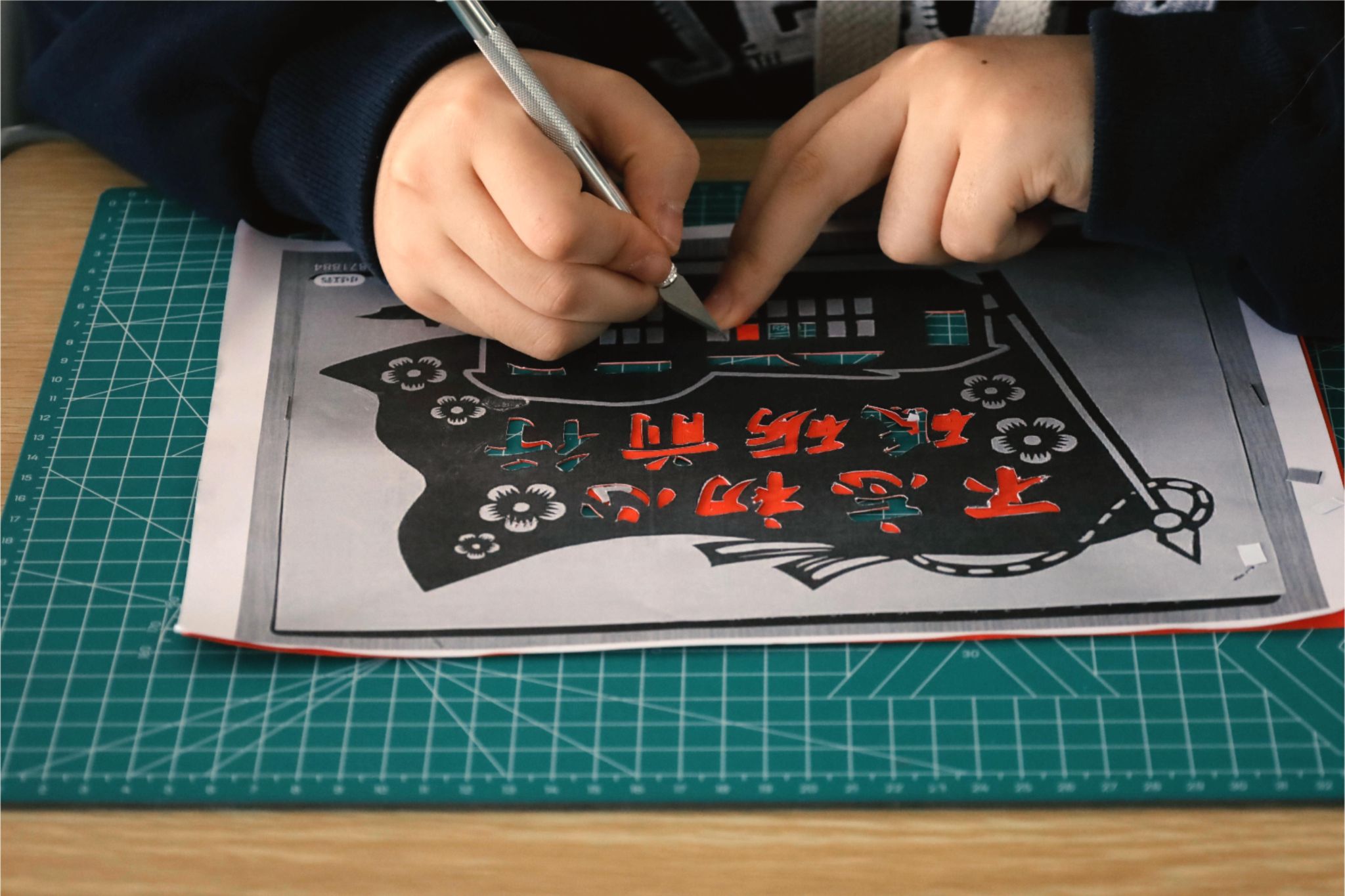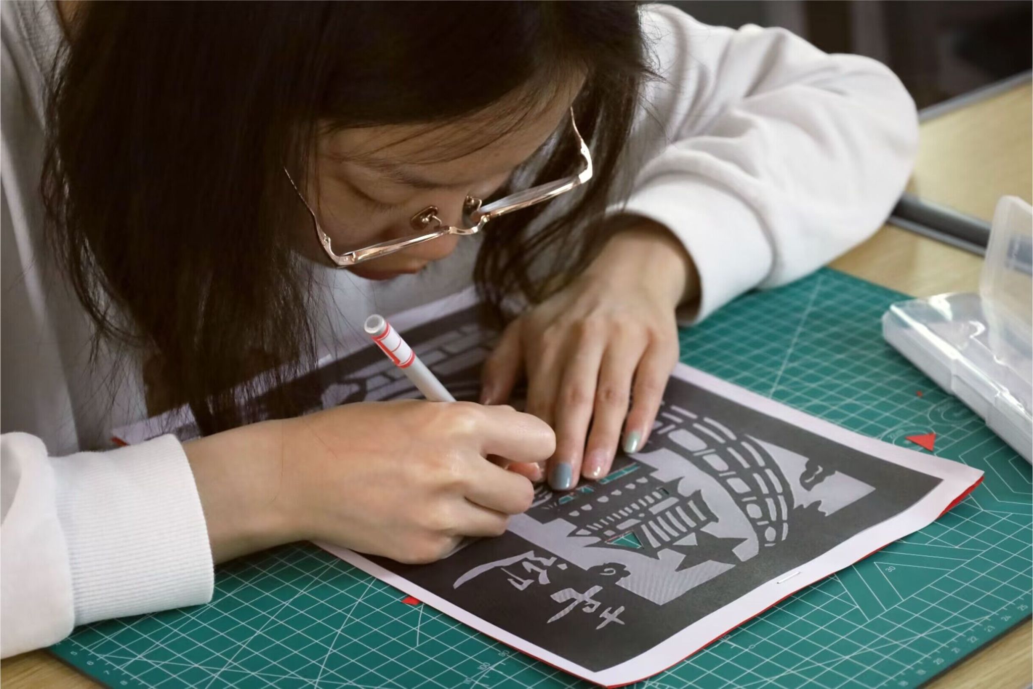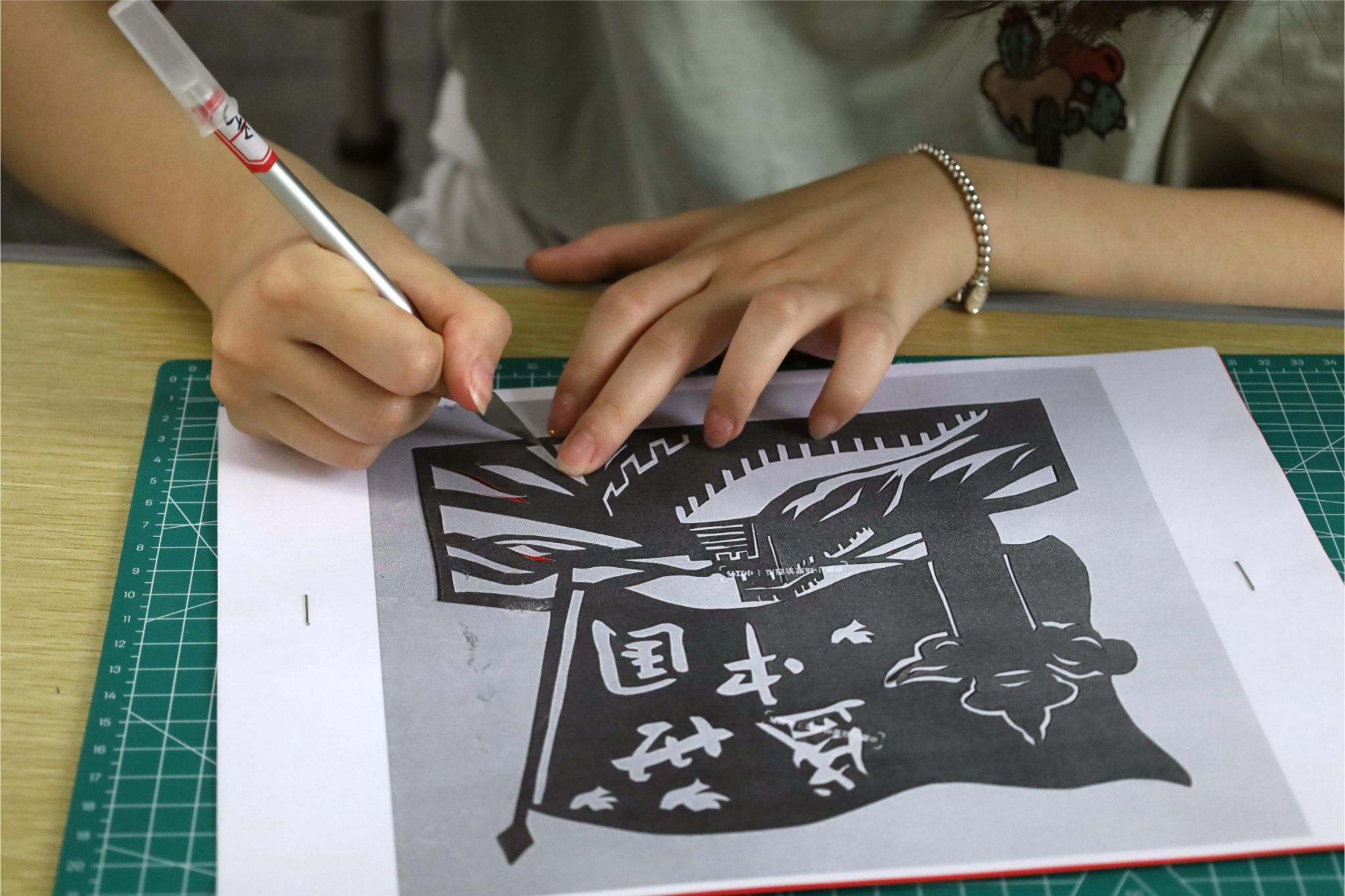 祥云之上,党徽被龙凤衔着的绿叶所环绕;党徽之下,象征着高洁清廉的荷花在恢宏壮阔的天安门广场盛开。雕刻出这样一幅图案精美、寓意吉祥的作品,对于初学者来说并非易事。“祥云上的每一条波浪,都需要缓缓转刀仔细雕刻,稍有不慎卡纸便会磨损。”历史学专业2022(3)班的黄婧斜坐在桌前,小心地掌握着力度,不敢有丝毫的松懈。