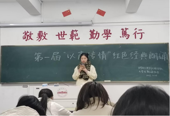 本次比赛,选手们结合红色影视、身着经典服装,向大家重新演绎经典故事,用现代声音来重铸红色经典之魂。2022级中国语言文学类(7)班方红艳同学带来的表演最为震撼人心。她铿锵有力的语调坚定而又婉转,讲述着那段热血的历史,体现了中国青年为革命事业抛头颅、洒热血的激情。她表示,在观看完红色影视后,不知用何种词汇描述自己的心境,只得以配音这种方式来诠释经典,诠释她心中的光与热。