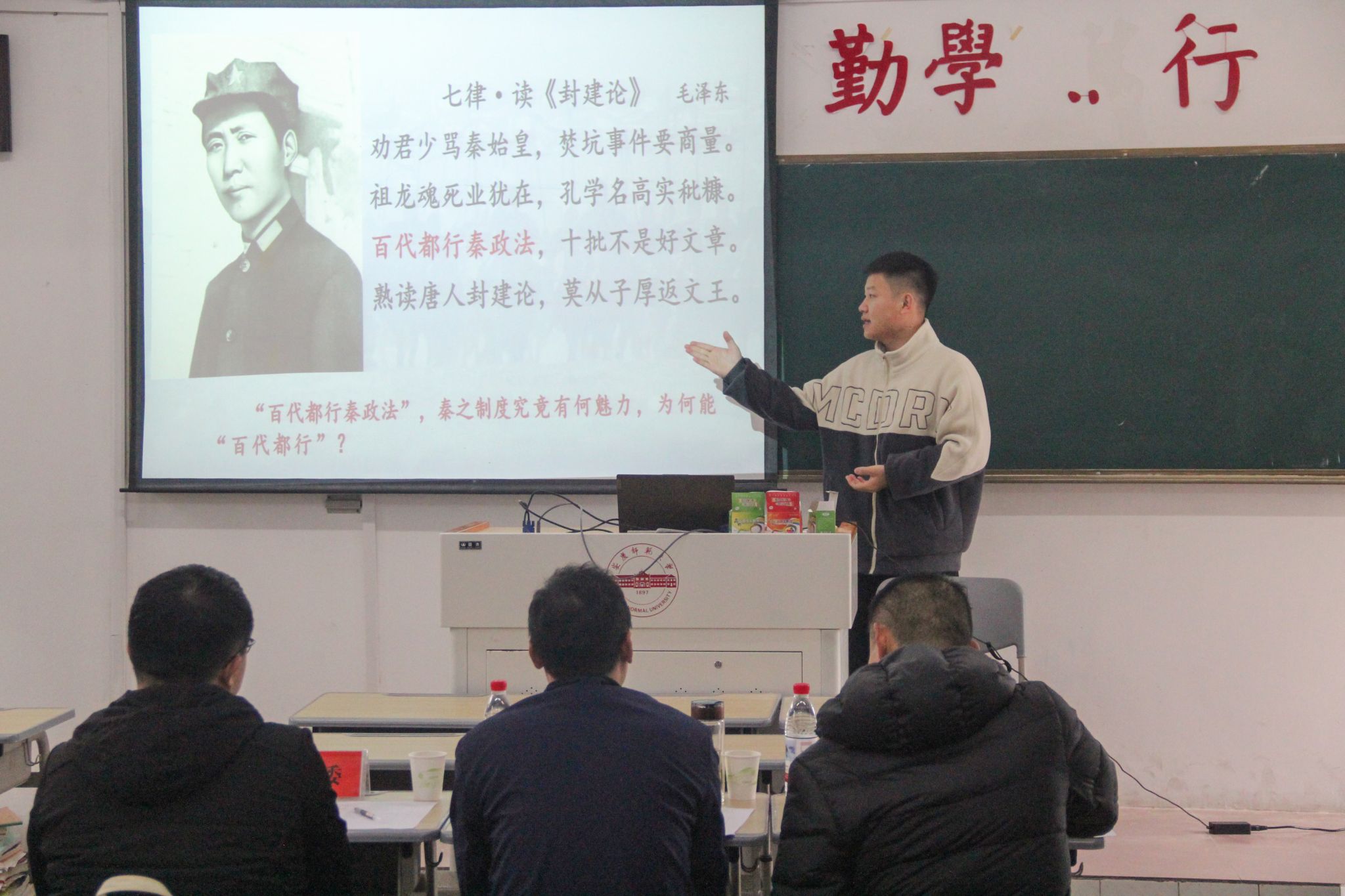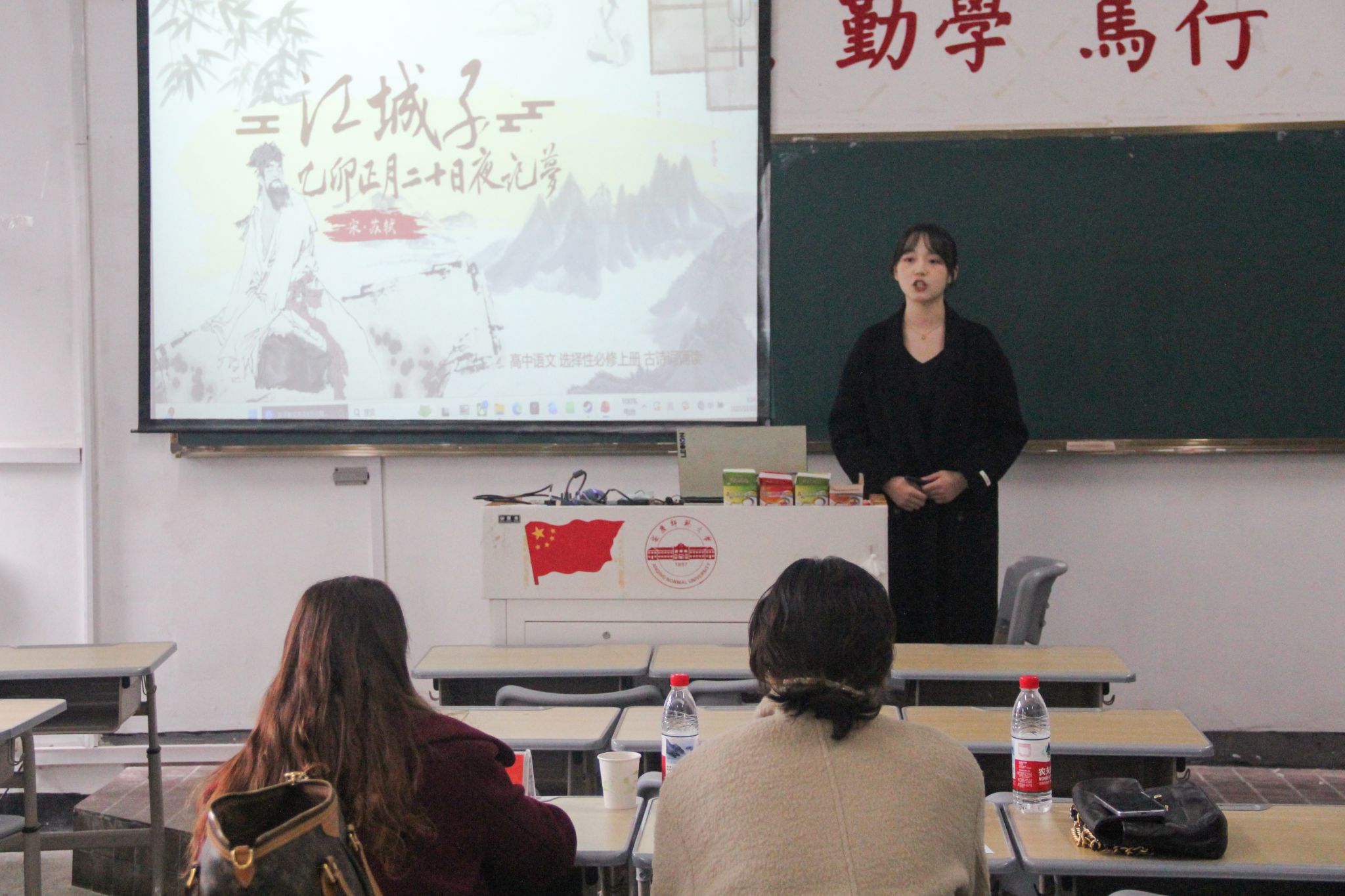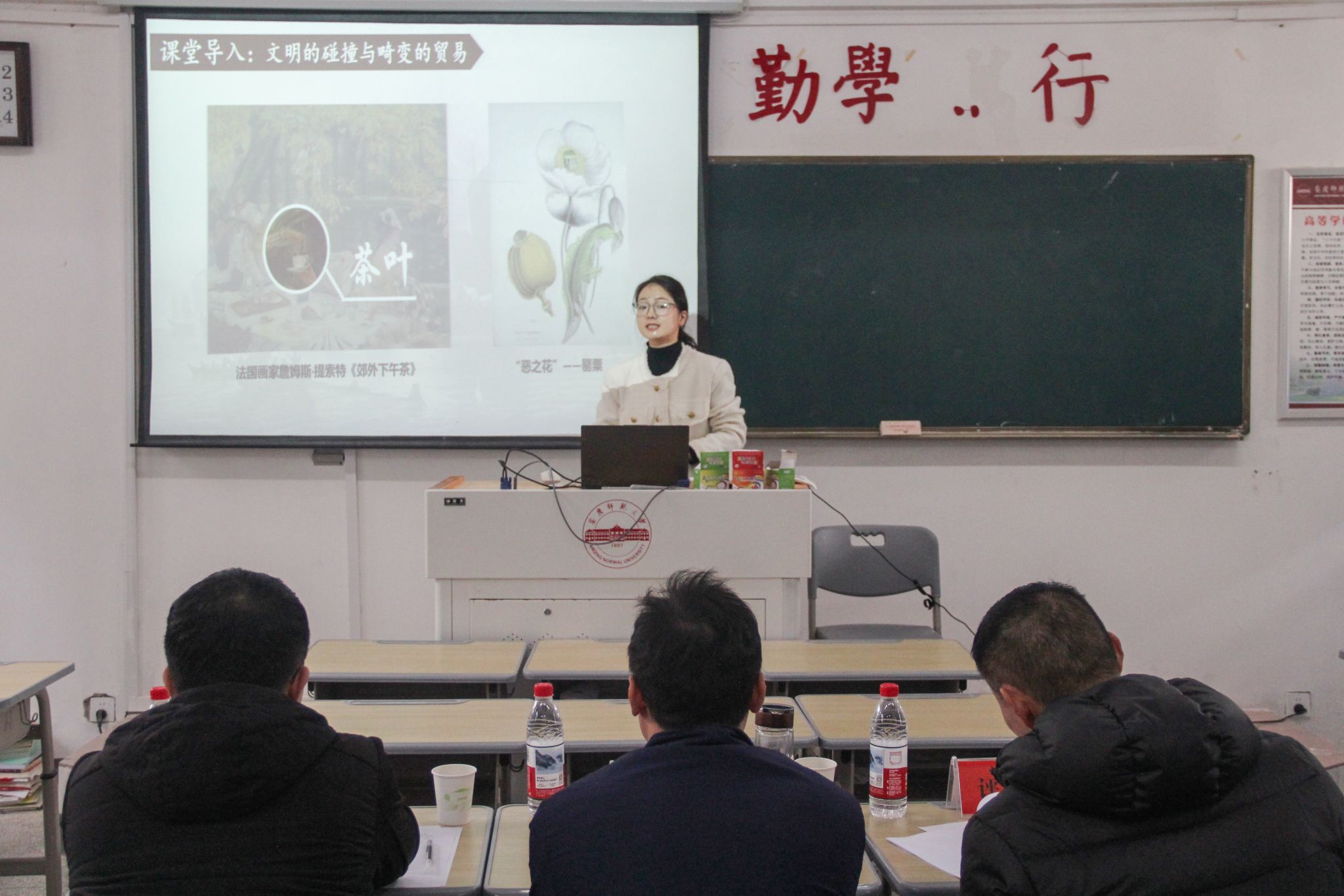 语文组14名学子或通过富有感染力的诗歌朗诵,或借助精心制作的视频,在经典讲读中传递文本情感,展现教学智慧。2024级学科语文王艳选择《赤壁赋》一课,从人物赏析中挖掘文本背后的思想内涵,展现出扎实的教学设计和课堂把控能力。历史组12名选手充分体现教学基本功,各有侧重,得到在场评委的一致认可。选手或通过工整规范的板书,将复杂的历史脉络梳理得一目了然;或通过流畅自然的互动提问,有效调动课堂氛围。2024级学科历史余庆明以文献为依据,多角度分析历史,并巧妙利用人工智能技术创新教学形式,使课堂变得更具趣味性和创新性。