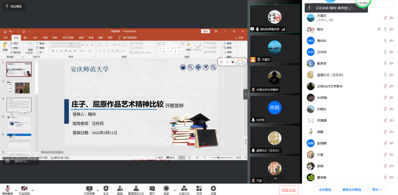 3月11日下午,suncitygroup太阳成集团中国古代文学学科线上举行研究生学位论文开题报告和中期考核汇报会。参与会议的老师有汪祚民教授、梅向东教授、汪孔丰教授、胡祥云教授、童岳敏教授、熊言安副教授、方盛汉副教授。本次会议由汪孔丰教授主持,中国古代文学方向20级硕士研究生参加开题答辩,19级硕士研究生参加中期考核,21级硕士研究生旁听本次会议。