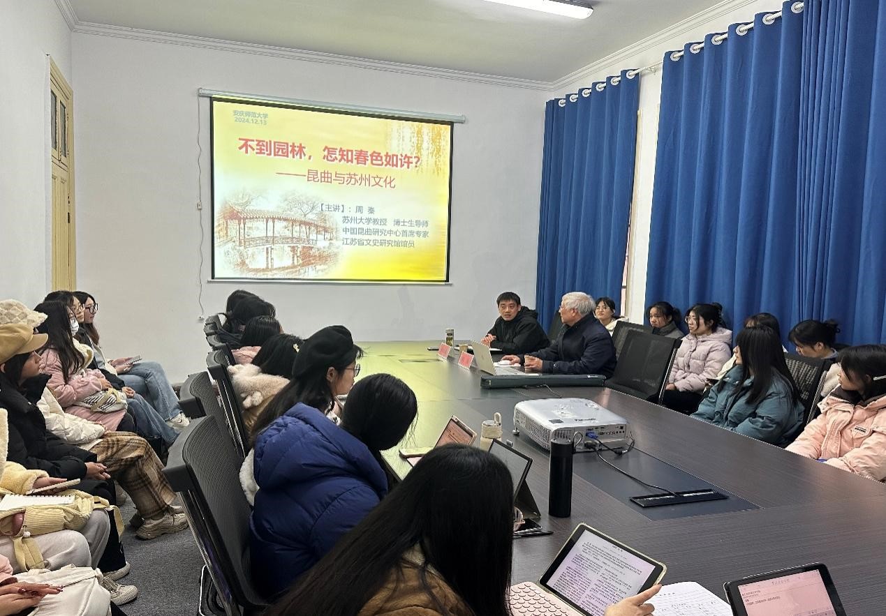 12月13日下午,苏州大学文公司教授、博士生导师、中国昆曲研究中心首席专家、江苏省文史研究馆馆员周秦应邀做客敬敷人文讲坛,主讲题为“不到园林,怎知春色如许?——昆曲与苏州文化”的学术讲座。讲座由suncitygroup太阳成集团皖江文化数字化保护与智能处理省级重点实验室执行主任童岳敏教授主持,公司本科生及研究生30余人聆听了本次讲座。