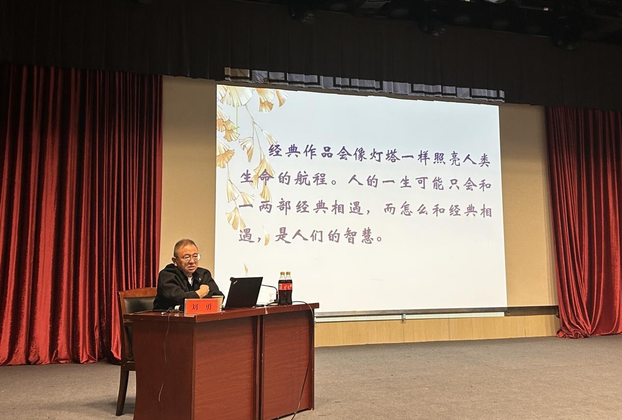 刘勇教授围绕什么是经典、为什么要读经典、如何读经典展开阐释。他指出AI时代阅读经典文学的重要性,强调经典文学能提供深刻的人生哲理,帮助个人在快速变化的时代保持内心的平和与稳定。为让听众直观感受经典的魅力,刘教授以鲁迅、余华、孙犁等文学大家的作品为例,进行深度剖析,阐述了文学作品的复杂性和多维度解读,鼓励读者根据个人经历探索作品。谈及“如何读经典”,刘教授提出“心读”的核心方法。他认为,经典阅读应沉下心来品味文字背后的深意,同时注重将阅读体验与个人生命体悟相融合,让经典真正内化为自身的智慧与素养。现场师生就阅读选择、读书方法等问题进行深入交流,氛围热烈。