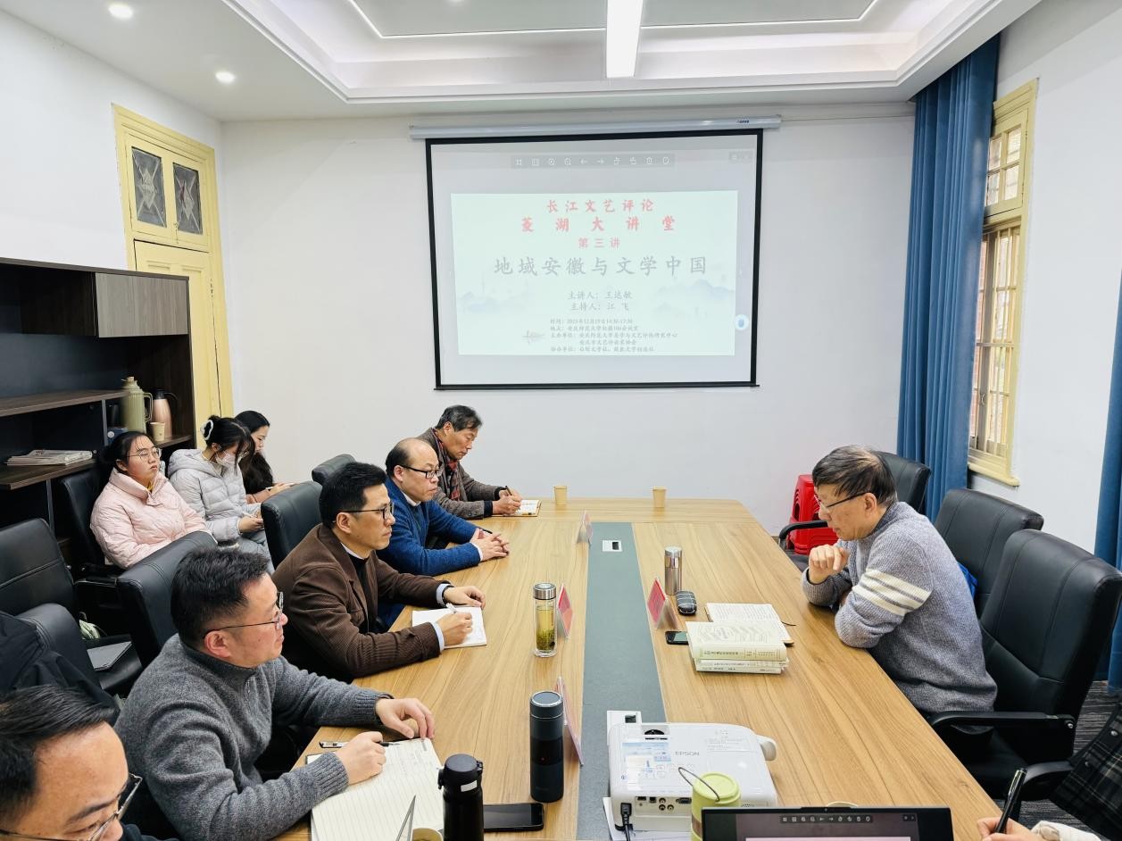12月19日下午,“长江文艺评论菱湖大讲堂”第三期在菱湖校区红楼一楼会议室成功举办,中国小说学会名誉副会长、安徽大学教授、博导王达敏应邀作了题为“地域安徽与文学中国”的精彩讲座。本次讲座由安徽省文艺评论家协会主席、suncitygroup太阳成集团美学与文艺评论研究中心主任江飞教授主持,来自中国现当代文学和文艺学专业的部分老师和研究生近20人参与此次活动。