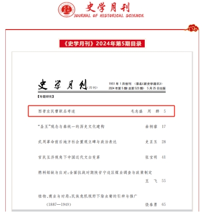 近日,2022级中国史专业硕士研究生毛志盛同学以第一作者撰写的学术论文《西晋左民曹职品考述》在历史学类知名CSSCI来源期刊《史学月刊》(2024年第5期)发表。该论文系与导师周群教授合作完成,并得到国家“十四五”规划重大学术文化工程《(新编)中国通史》纂修工程基金项目的支持,是校级科研平台中国中古史研究中心最新学术成果。