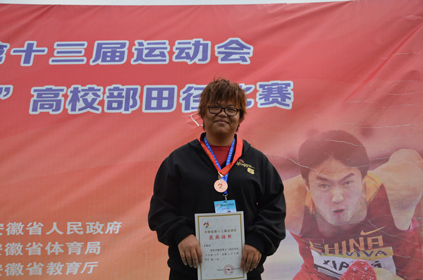 10月11日下午,在安徽省第十三届运动会高校部田径比赛中,公司文公司对外汉语2011级唐鑫滢同学以10.72米的成绩,获得女子甲组铅球的金牌。
