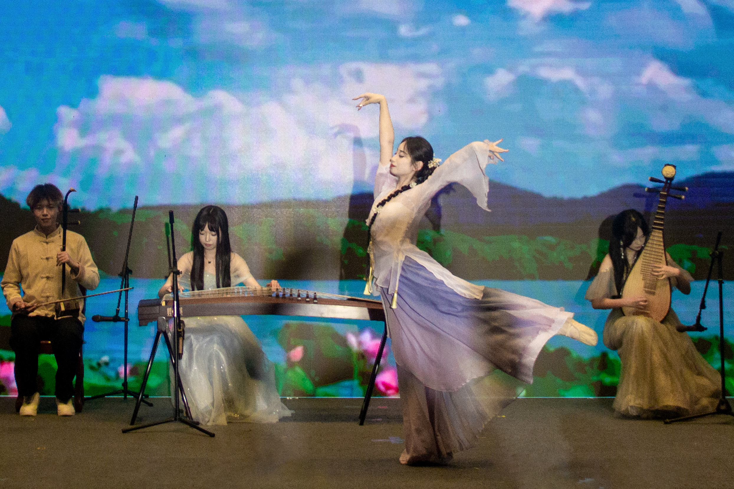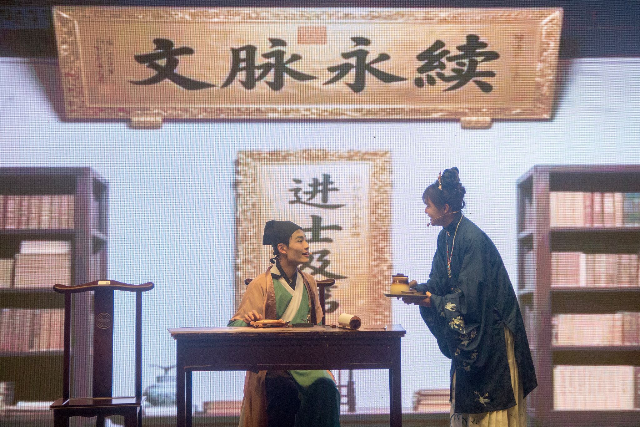 “朝碧海而暮苍梧,睹青天而攀白日。”作为晚会的重头戏,话剧《碧海苍梧》讲述了我国迈出科学考察长江江源征程的第一人徐霞客文明寻根的故事,剧本创作者之一、中国语言文学类专业 2024(1)班的陈心怡在研读《徐霞客游记・江源考》等文献时,被他勇于探索、坚定执着的精神所感动,“与指导老师商量后,我们敲定了这个选题,希望通过这部话剧,让更多同学从徐霞客执着‘探源’的人生追求中,领悟长江文化的精神内核,形成敬畏自然的文明自觉,激励同学们在找寻‘何以中国’的答案中,成为文化寻脉的践行者。”