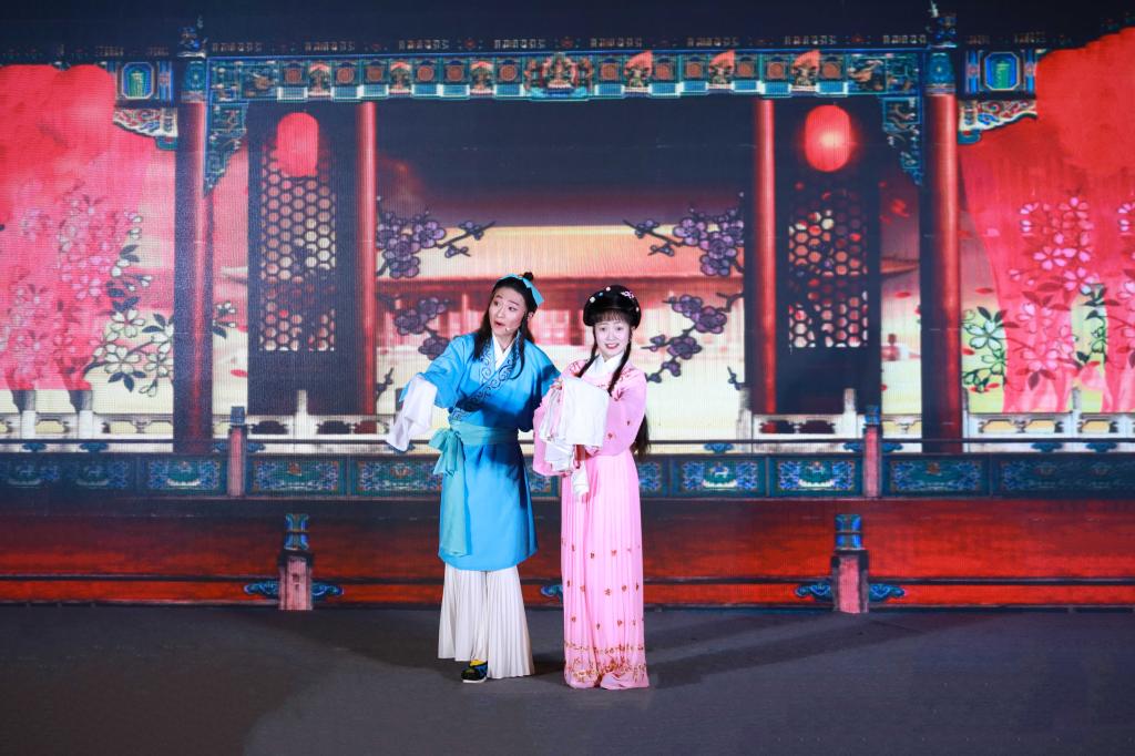 古筝悠扬、琵琶清脆,表演者们身穿汉服,用多种民族乐器合奏民乐《盛世国乐》,谱写一曲有关中华文化的绚丽华章;唱念做打、梨园韵味,黄梅戏《女驸马》《天仙配》选段亮相,让观众领略到了戏曲的珠玉之声;古典舞《沁莲》的9位表演者,则装扮成了敦煌壁画中的“飞天神女”,配上敦煌洞窟的背景,舞姿轻灵,宛若游龙。