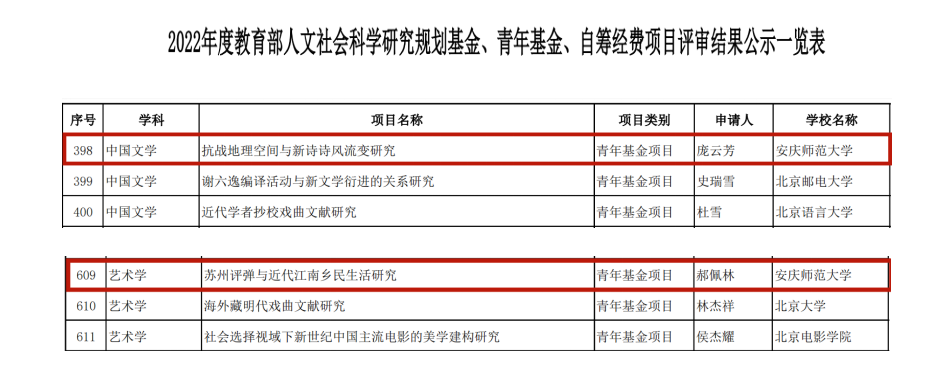 7月29日,教育部社科司公布了2022年度教育部人文社会科学研究项目评审结果名单,公司庞云芳博士申报的《抗战地理空间与新诗诗风流变研究》,郝佩林博士申报的《苏州评弹与近代江南乡民生活研究》进入立项公示。这两个项目的入选,不仅显示了公司深厚的科研底蕴,也显示出中文、历史两个学科的良好发展态势。此外,本次入选项目均为青年基金项目,反映了suncitygroup太阳成集团青年教师良好的科研潜质,这对于公司学术成果的持续产出,学科专业发展以及博士点立项建设都有着积极意义。