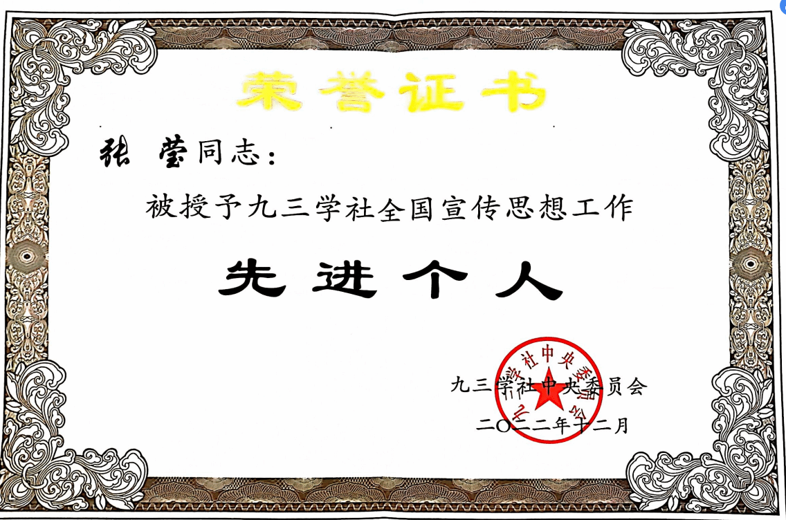 张莹同志因在宣传工作中成绩突出,先后被评为安徽省“坚持和发展中国特色社会主义学习实践活动”先进个人、九三学社安徽省委员会“社务工作先进个人”称号。