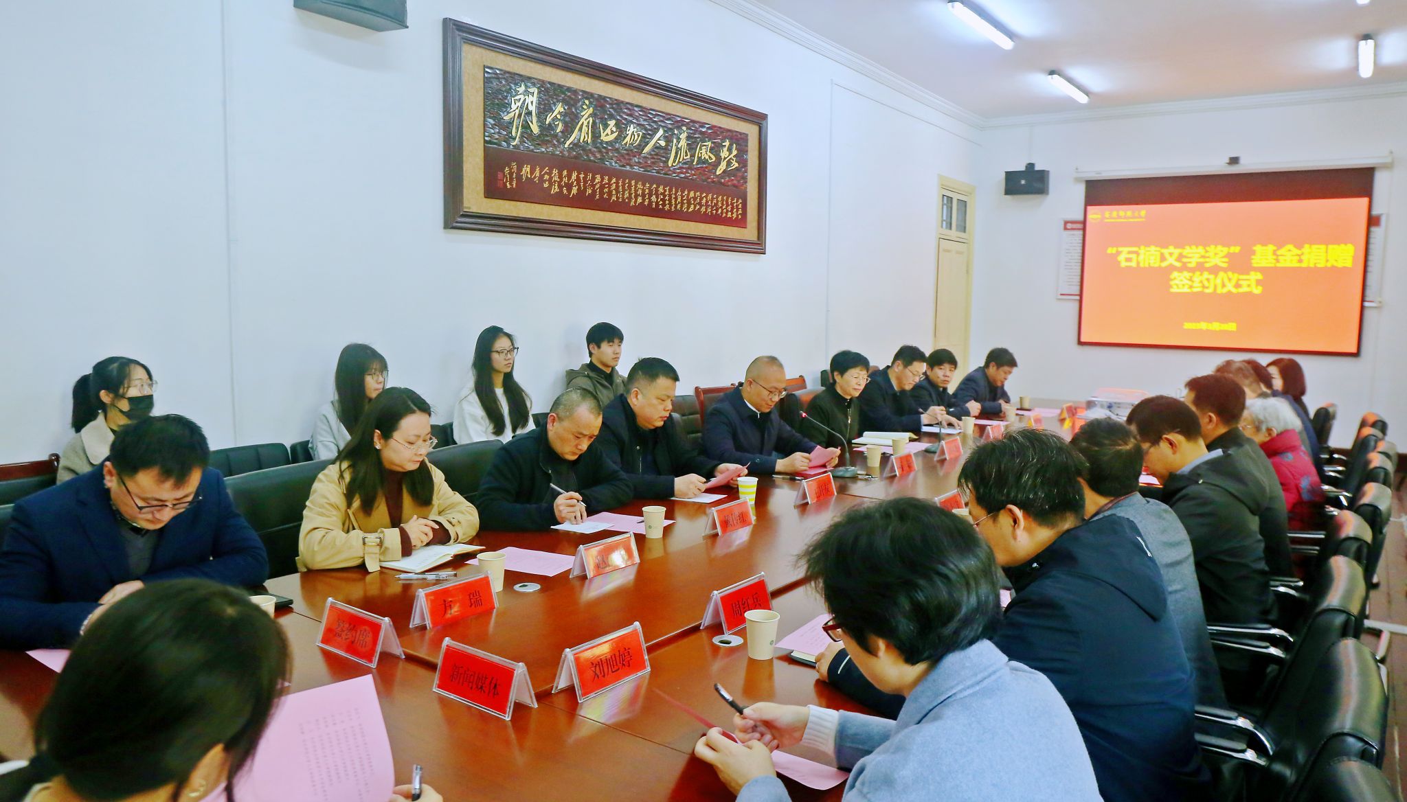仪式现场,副董事长肖新和作家石楠共同签署了捐赠协议。