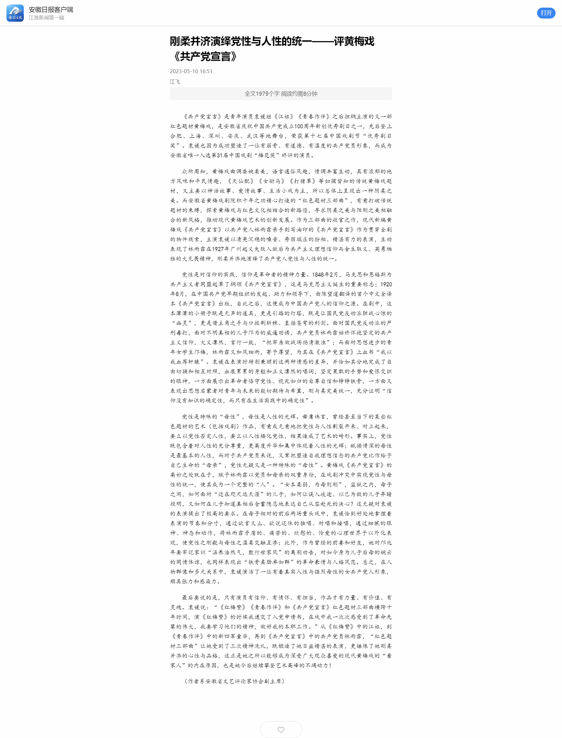 近日,《安徽日报》刊发公司江飞教授撰写的评论文章《刚柔并济演绎党性与人性的统一——评黄梅戏<共产党宣言>》。该文以现代新编黄梅戏《共产党宣言》为例,阐述了现代黄梅戏创作积极探索黄梅戏与红色文化相结合的新路径,积极宣扬作品主人公为共产主义理想信仰而舍生取义、英勇牺牲的大无畏精神,褒扬了主演刚柔并济地演绎了共产党人党性与人性的统一。