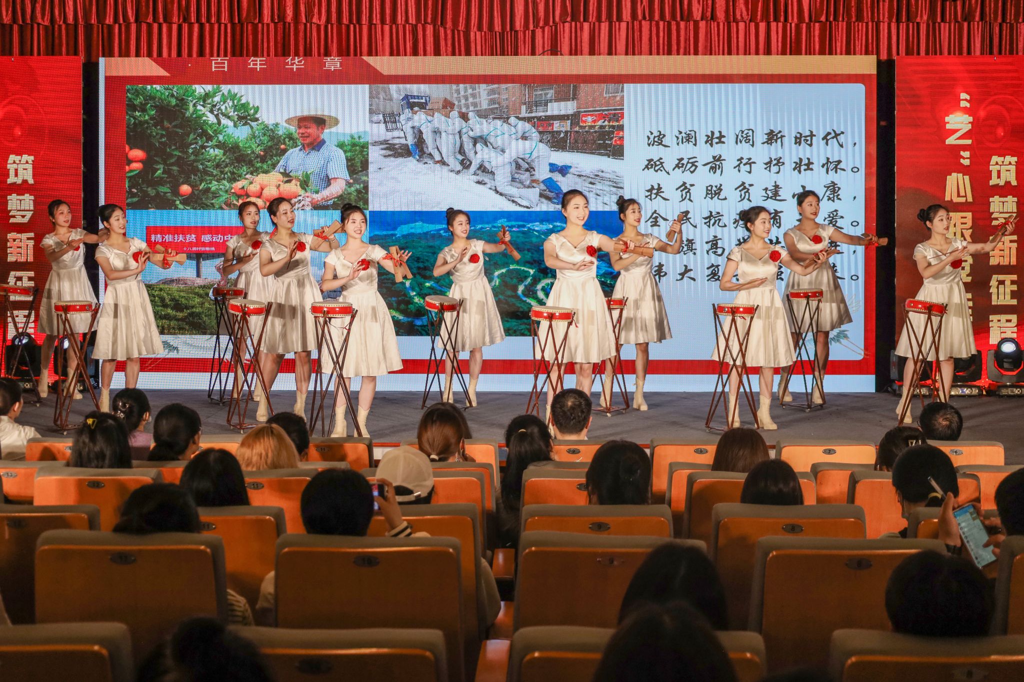 百年奋斗,百年追梦,百年恰是风华正茂。黄梅剧艺术公司11名学子胸口配花,身着统一服饰,带来黄梅大鼓表演《百年华章》。节目融入传统的黄梅调音乐唱腔元素,员工们在舞台上唱大鼓、打竹板,温婉中不失气势,豪迈中柔情尚存。婉转的戏腔,自然的神情,铿锵有力的击鼓,员工们通过不同的唱词和舞台走位,生动演绎了党在不同历史阶段的发展历程。