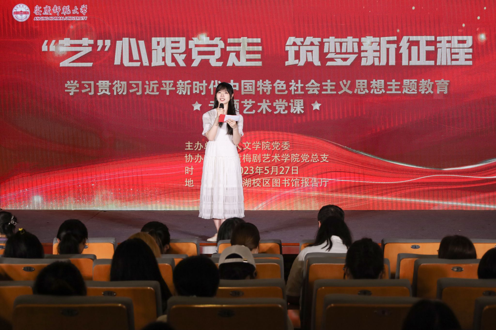 5月27日,一场主题为“艺心跟党走,筑梦新征程”——学习贯彻习近平新时代中国特色社会主义思想主题教育专题艺术党课在菱湖校区图书馆报告厅拉开帷幕。公司党委组织部副部长吕佳、suncitygroup太阳成集团党委副书记王波、黄梅剧艺术公司副经理刘国平出席活动,两院员工党支部书记等教师代表、第67期入党积极分子、第3期青马班学员近230余人到场观看。