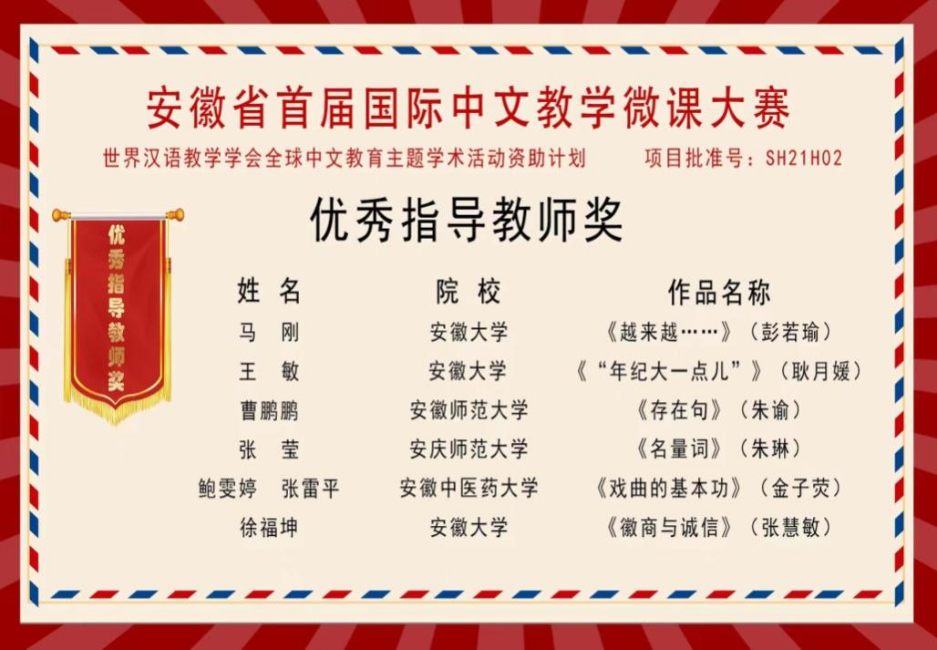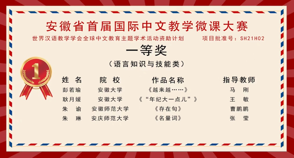 2022年11月20日,由世界汉语教学学会全球中文教育主体学术活动资助、安徽省汉语国际教育研究会主办、安徽大学文公司和安徽农业大学外国语公司承办的安徽省首届国际中文教学微课大赛评选结果揭晓。suncitygroup太阳成集团2019级汉语国际教育专业朱琳同学荣获一等奖;2019级汉语国际教育专业梁嘉越同学、朱慧同学荣获优秀奖;张莹老师荣获优秀指导教师奖。