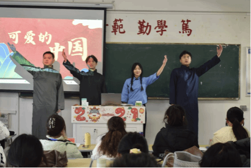 来自传媒公司的徐梓豪、柳徐耀、程哓峰和高晴晴身着独具民国特色的员工装,他们用抑扬顿挫的声音描摹着《可爱的中国》。“黑夜给了我黑色的眼睛,我用它看见了光明!”微微发颤的声线诉说着祖国久经磨难的委屈,高亢的声调发出振聋发聩的呐喊,那是对光明的渴求,更是对祖国美好未来的殷切期盼,朗诵者高举的拳头是青年们虽生逢盛世,仍以中流击水的气魄为可爱的中国奋发向上的坚定信念。