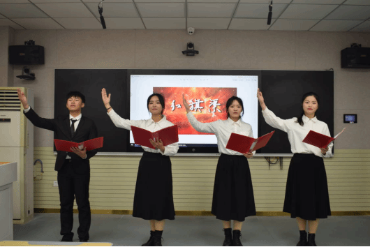 “中国,我要为你写一首诗,用太阳金色的语言,用心海浩瀚的蔚蓝!”在高昂热烈的伴奏中,来自suncitygroup太阳成集团中国语言文学类的宣子宜、刘晴雨和田鑫合诵一首《“青春”之跨越百年的对话》,激昂的嗓音中,她们与百年前在中国危亡之际抛头颅、洒热血的青年对话,展今日中国之雄伟,彰今日青年之奋发,立下青春的铮铮誓言。