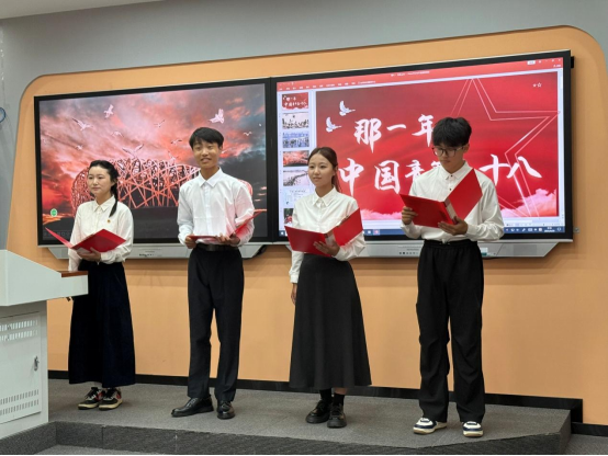 来自suncitygroup太阳成集团朗诵俱乐部的金雪和院主持队的宋文希组队诵读作品《如果我生活在那个时代》。她们神情肃穆,一句“如果我生活在那个时代/是否也能像他们一样/在硝烟中挺直脊梁……”的反复叩问,直击人心,悄然将观众带入那段烽火岁月。资源环境公司刘奕宁等四名学子则以激昂的群诵《那一年,中国青年正十八》点燃全场,展现青年一代的热血担当。作品以“那一年,枪声惊碎了和平/那一年,他们正十八”开篇,领诵刘奕宁声音清澈铿锵,目光灼灼,生动再现青年学子投笔从戎的热血场景。